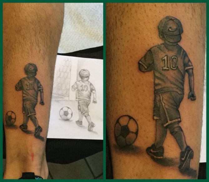 Még egy egyszerű labdarúgó is jól néz ki. És nagyon is lehetséges fekete-fehéren kitömni. A mesterek még a színezéstől is eltanácsolják. Néhányan azonban még mindig figyelemfelkeltőbb, figyelemre méltóbb képet szeretnének. Ebben az esetben a kétszínű kép jó megoldás. A kék-fekete, piros-fekete tetoválások remekül mutatnak. A szakemberek szándékosan árnyékolják egy kicsit a hátteret, valamint magát a képet, hogy a kép jobban észrevehető legyen.