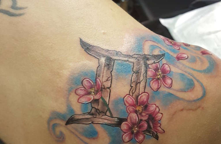 Gemini tetoválás virágokkal