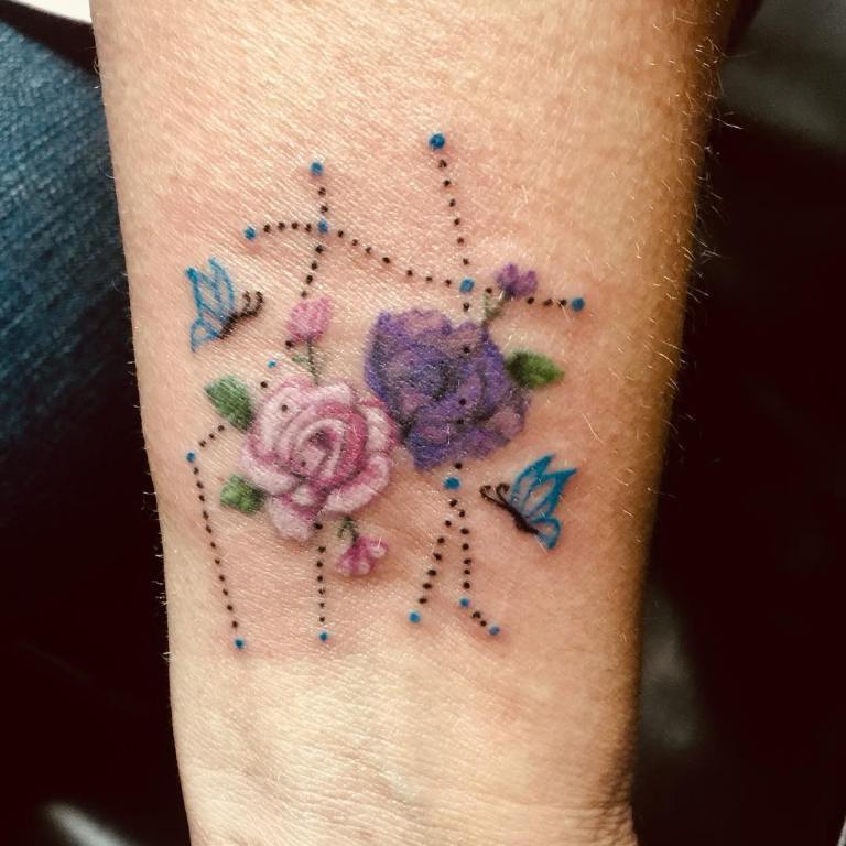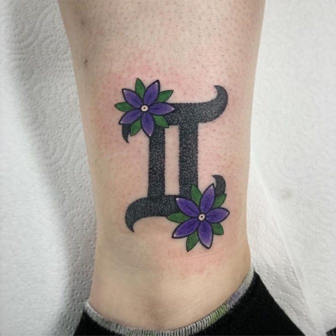 A virágos kiegészítéssel ellátott ikertetoválás nagyon finom és nőies megjelenésű. Ezért végzik leggyakrabban női testen. Nagyon szép megjelenésű kép, amelyben a fő elem a virágos elemek. Egy ilyen tetoválás frissnek és szépnek tűnik. Leggyakrabban a lányok végzik a nyak hátulján vagy a csuklón. Az ábra végrehajtásához nyugodtan használhat zöld, piros, rózsaszín, sárga vagy fekete színeket.