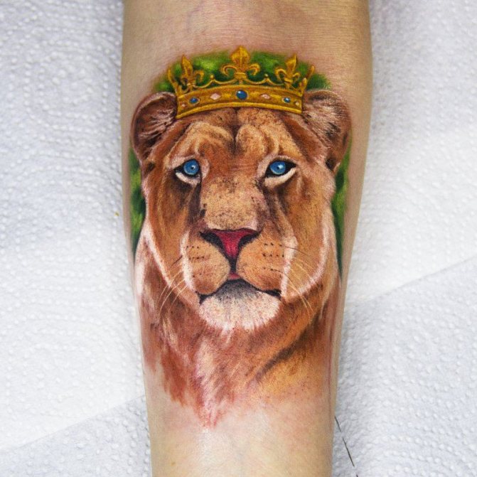 Amikor egy nőstény oroszlán nőstény oroszlánkölykökkel van ábrázolva a testén, az azt jelzi, hogy ő egy anya, aki megvédi a gyermekeit. Ritkán találni olyan képeket, ahol a vadállatok királya egy gyengébb állat mellett van. Ez a tetoválás azt jelzi, hogy az illető harmóniát keres a körülötte lévő világgal, és megismeri önmagát.