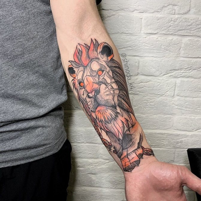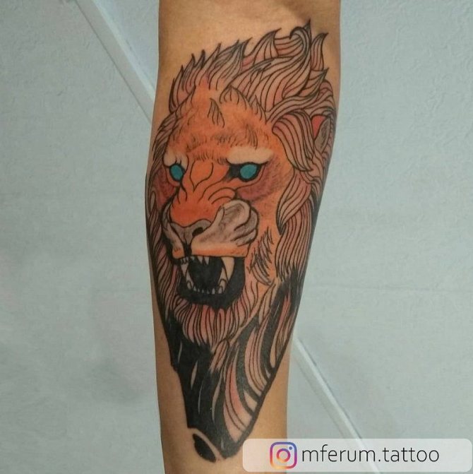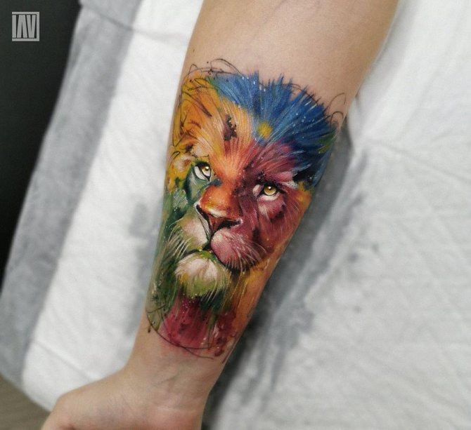 Az akvarell stílusú oroszlánfejet a lányok nem gyakran alkalmazzák a testre. Ha egy ilyen vázlatot választanak, akkor az állat általában 2 színnel festett pofája simán átfolyik a testbe és a végtelenbe a rajzolat oldalain. Annak ellenére, hogy ezt a tetoválást a férfiak kedvelik, a minta fantáziadúsnak és misztikusnak tűnik.