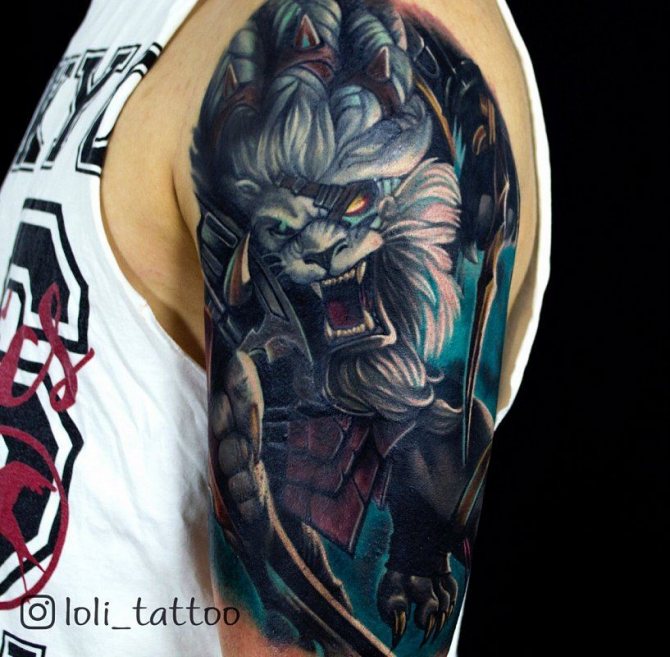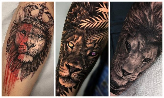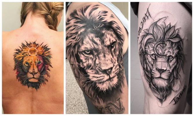 Fekete, piros, piros és színes oroszlán tetoválás: vázlatok, fotók