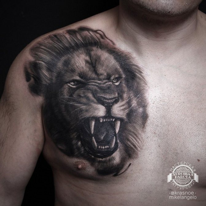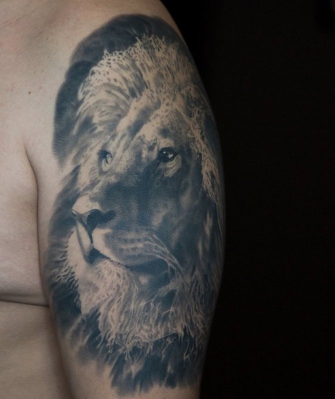 Ha a tetoválás a vállra vagy a lapockára kerül, a mesterek nagyméretű képet rajzolnak a fejről vagy a vadállatok királyának egészéről. Az oroszlán ülhet, feküdhet vagy állhat. A portrét virágok, indák vagy levelek is kiegészítik.