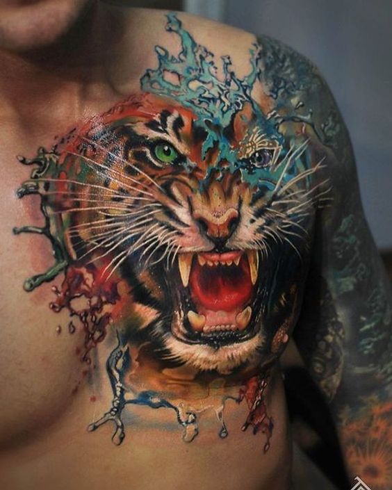 Sok művész az akvarell technikával végzi munkáját, mivel ez a változat ragadja meg legjobban a telített tónusokat és a design érzelmeit. Például a tigris formájú tetoválást narancssárga árnyalatokkal végzik. Ez nemcsak az állat színét, hanem a díszítés pompáját is lehetővé teszi. Az élénk narancs és a fekete szín keveredése tökéletesen kiemeli a férfi erős és jellegzetes arculatát.