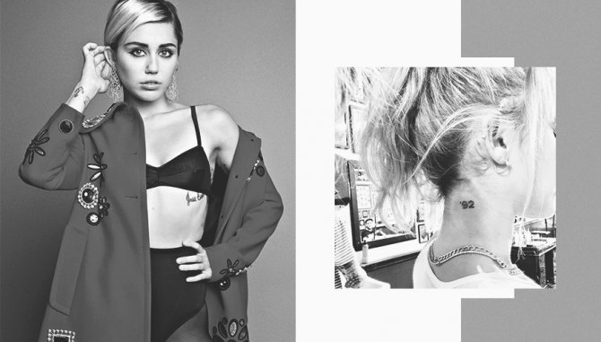 A tetoválás másik szerelmese Miley Cyrus. Már van a testén egy késsel átszúrt virág, egy Henri Matisse stílusú női sziluett, egy pasztás doboz és más képek. A tarkóján, a tarkójához közel, a 92-es szám látható - Miley születési éve.
