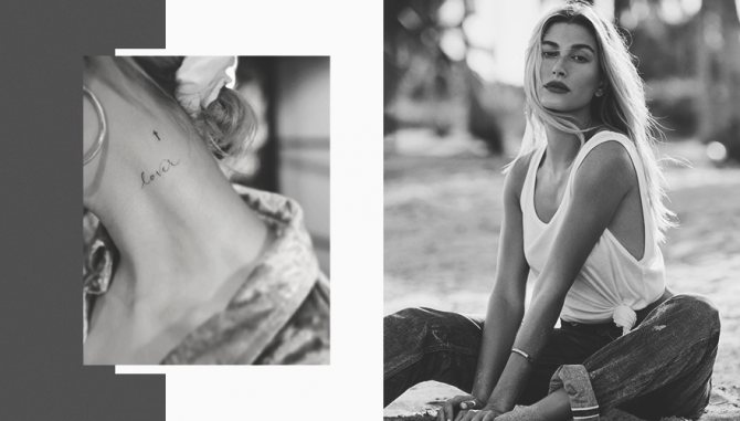 Hailey nyakán is van egy tetoválás - ez a "szerető" szó. Justin viszont az "forever" szót tetováltatta a nyakára, ami Hailey tetoválásával alkot egy kombinációt. A pár szeret tetoválásokat szentelni egymásnak, Justin teste nem az első szimbolikus szerelmi vallomás Hayley számára.
