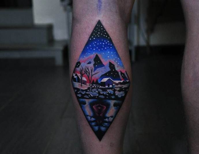 Con un tatuaggio a rombi colorati, le ragazze esprimono la loro anima e mostrano i loro hobby. In questi disegni, la figura geometrica è riempita con immagini che indicano gli hobby del proprietario - queste possono essere montagne affascinanti, foreste misteriose o un tramonto in mare. Il proprietario di un tatuaggio luminoso è una personalità originale e a tutto tondo, che non rifiuta mai l'opportunità di ottenere nuove impressioni.
