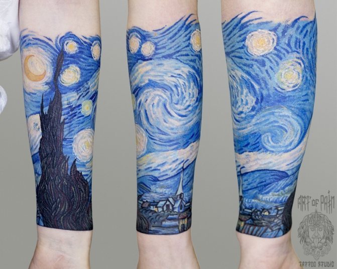 Infine, una persona può ottenere un tatuaggio raffigurante il suo quadro preferito. Un tale tatuaggio avrà un aspetto originale, anche se, affinché l'idea sia incarnata correttamente, dovrà spendere molto tempo alla ricerca di un tatuatore esperto.