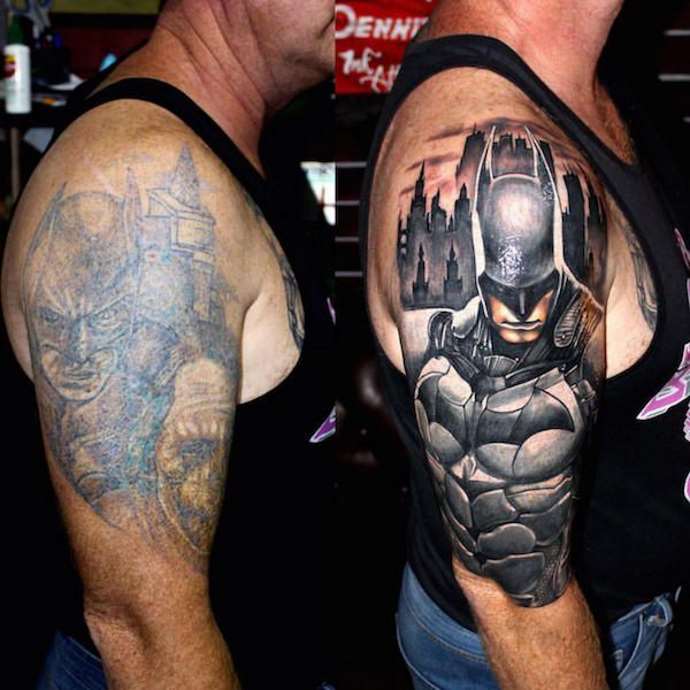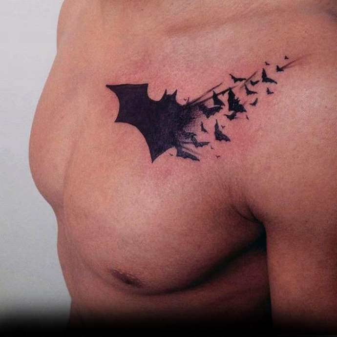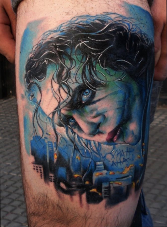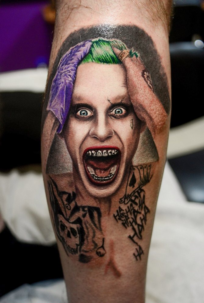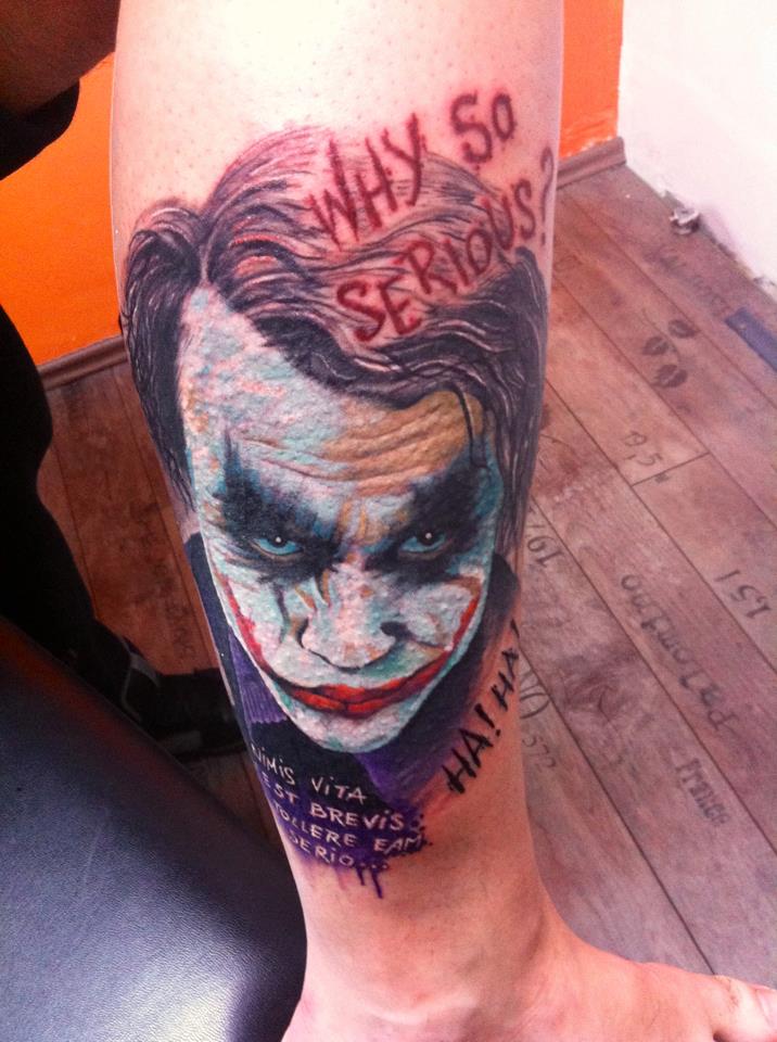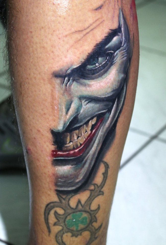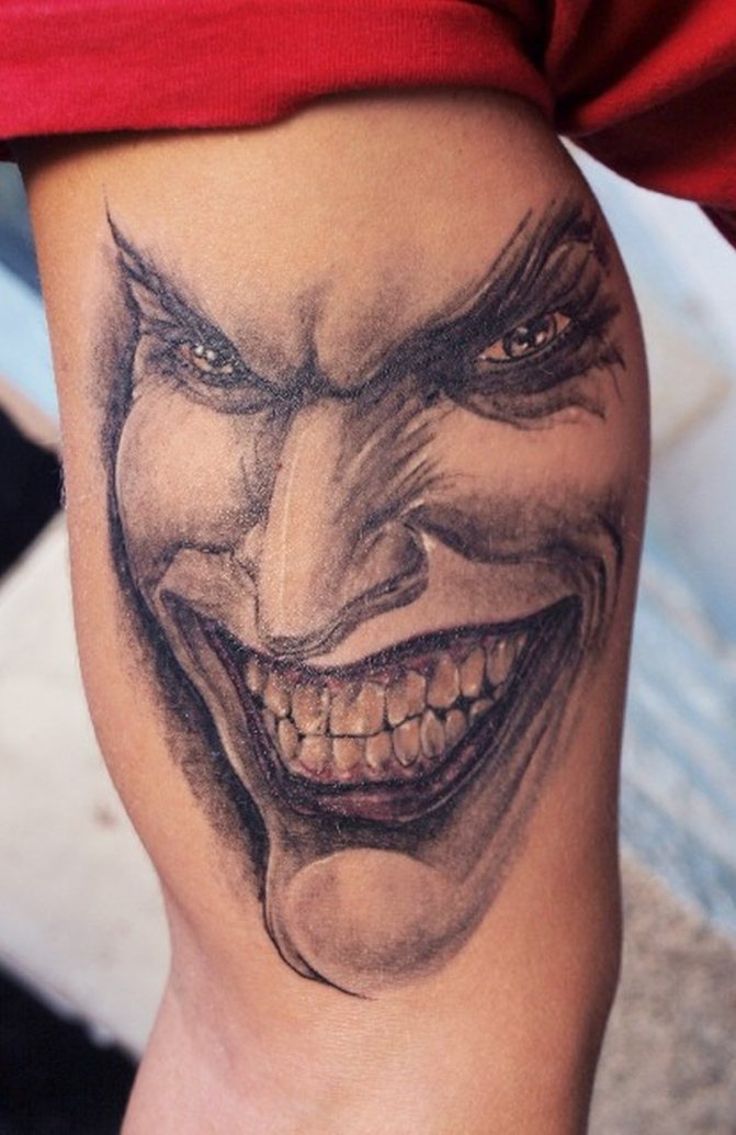 - I fan dei film di Batman scelgono una rappresentazione realistica dell'amato personaggio cinematografico: con labbra rosse e vernice agli angoli della bocca, indossando un vestito e una cravatta. A volte, il tormentone del personaggio "perché così serio" viene aggiunto al tatuaggio.