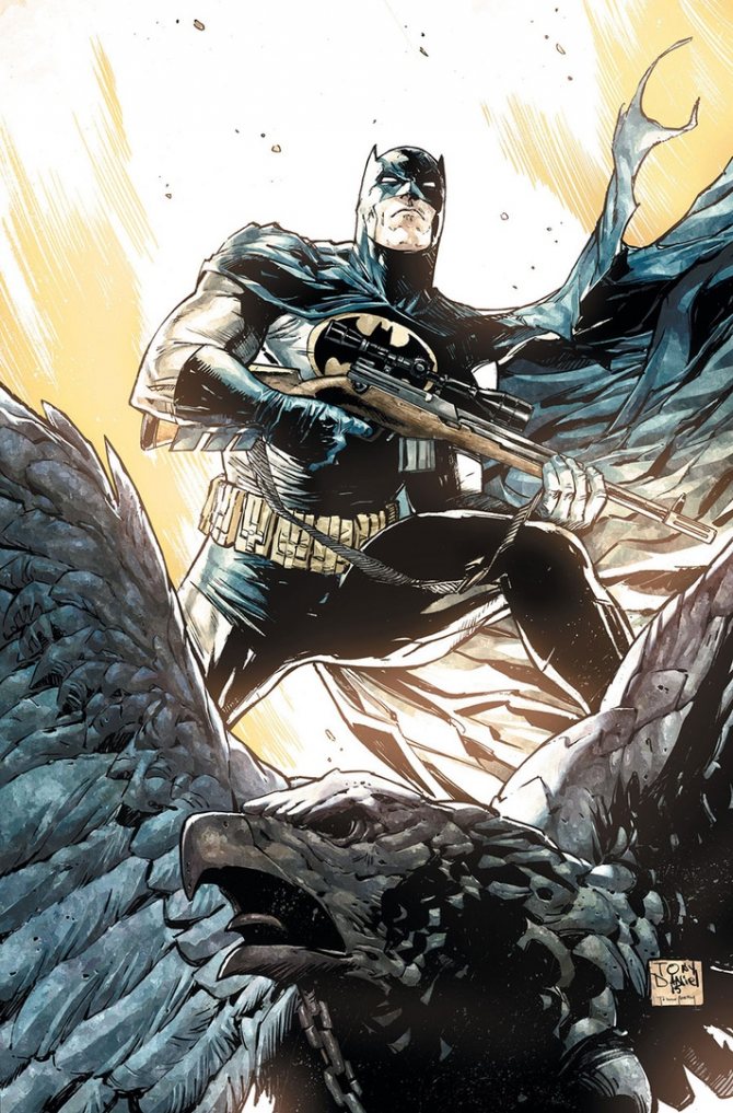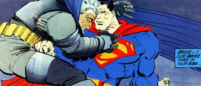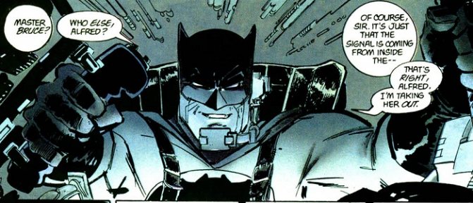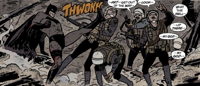 È impossibile dire esattamente a che punto della storia di Millervers si svolge il crossover. Ma che la sua azione si svolge in questo universo è dichiarato nell'introduzione alla schermaglia stessa. Batman qui è abbastanza esperto da non essere un novellino di Anno Uno, ma non abbastanza vecchio da essere un veterano invecchiato delle avventure successive. Quindi infiliamo il fumetto da qualche parte tra queste fasce orarie e non facciamoci prendere dal panico. In esso, il Cavaliere Oscuro combatte robot giganti (anni '90!), vola con un missile nucleare (ESTREMO) e lascia il suo segno duraturo sulla faccia di Spawn (nel vero senso della parola!). Un breve e allegro vanshot è ottimo per rallegrare una serata. E non ha bisogno di molto altro. Andare avanti.
