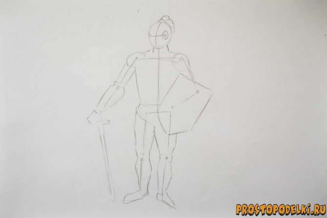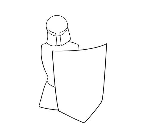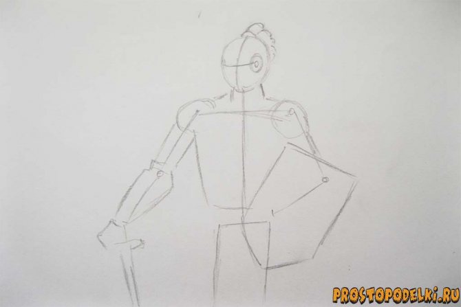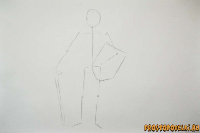 - Le linee mostrano l'asse del corpo, il collo, le gambe e le braccia. Al posto della testa, viene mostrato schematicamente un casco girato di lato. Al centro traccia una linea verticale che crea l'effetto volume del casco. Le gambe del guerriero sono dritte e le sue braccia sono piegate per tenere lo scudo e la bandiera.