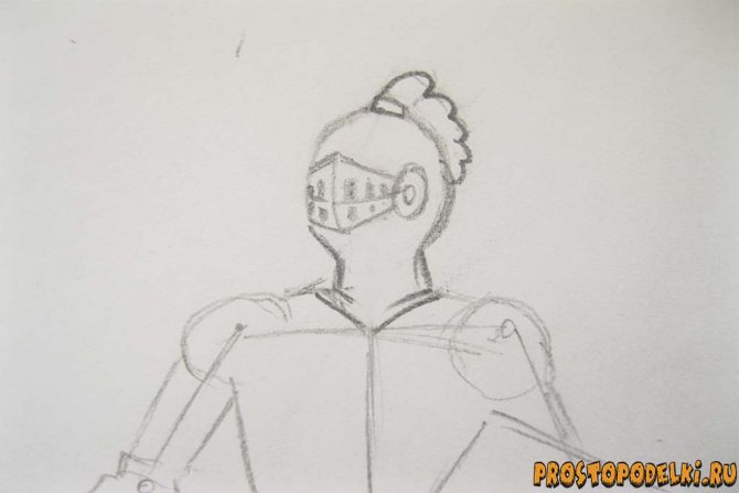 - Dettagliare il casco: fare un casco verticale da shock, delineare il contorno generale, i fori per gli occhi e dipingerli. I fori di respirazione ripetuti sono disegnati sul fondo del casco. Questi fori sono equamente distanziati e della stessa dimensione.