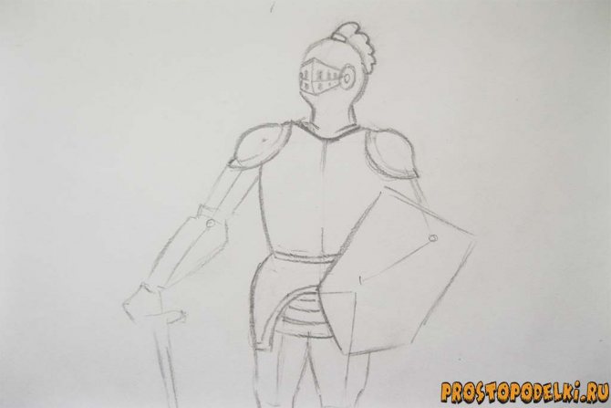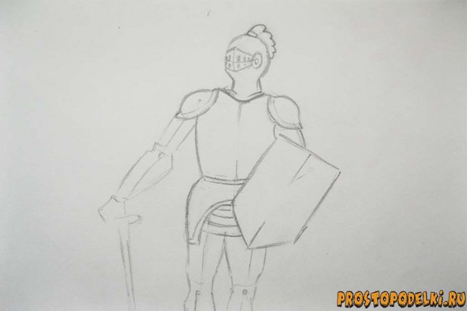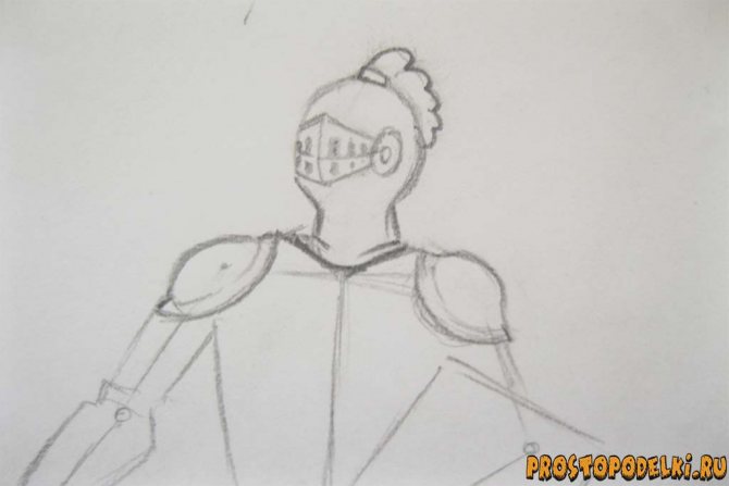- Usando lo schema finito disegnate un chiaro contorno del busto del cavaliere, collegando il collo, le braccia e il busto. Ulteriori parti metalliche sono disegnate in corrispondenza delle curve. Disegna una faccia girata e un elmo con cotta di maglia.