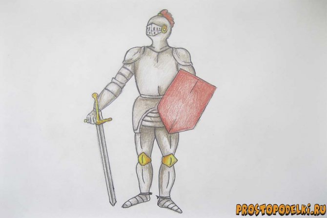 Il cavaliere in armatura (un disegno di questo personaggio storico può essere mostrato su un cavallo) tiene uno stemma, il cui simbolo i bambini possono pensare da soli o sostituirlo con una spada. Questa versione di disegno è adatta ai bambini delle scuole medie e superiori o a coloro che hanno capacità di disegno, poiché è necessario rispettare le proporzioni del corpo del cavaliere e del cavallo, così come disegnare piccoli dettagli.