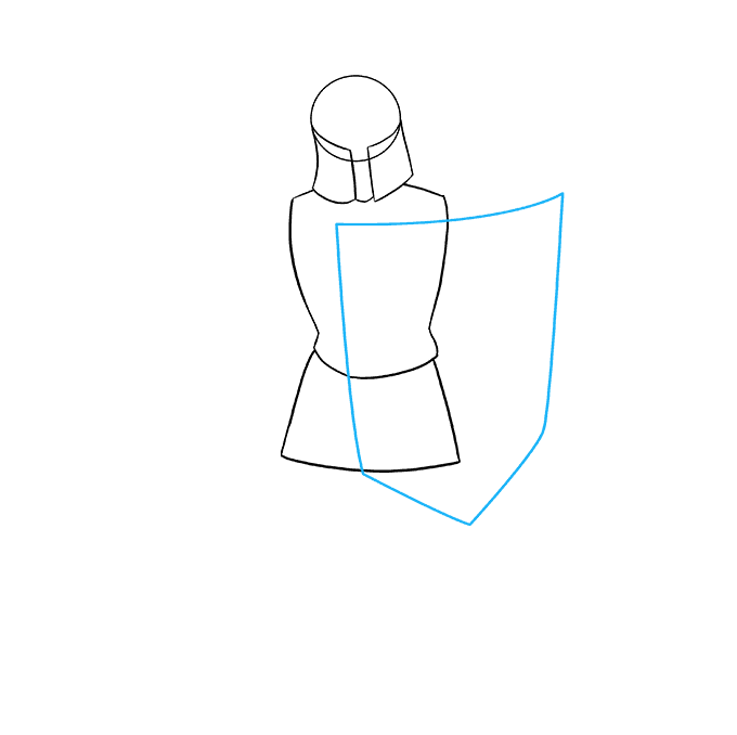 4. Poi disegna lo scudo. Iniziate con lo scudo grande disegnando una linea curva attraverso la pettorina, estendendola sopra la spalla. Poi disegna un paio di linee leggermente curve verso il basso da ogni estremità. Da queste linee, piegare un paio di linee rette verso l'interno fino a quando si incontrano in un punto.