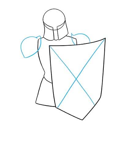 6. Decora lo scudo disegnando delle linee diagonali che si intersecano al centro con un angolo perpendicolare. Poi disegnate le spalle dell'armatura. Disegna una linea curva come un semicerchio. Poi traccia una breve linea ad ogni estremità. Collega queste linee usando una linea curva più lunga.