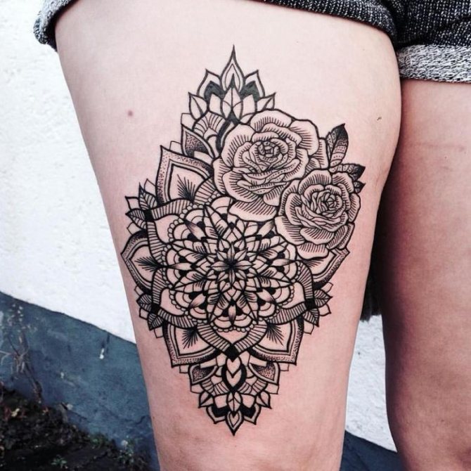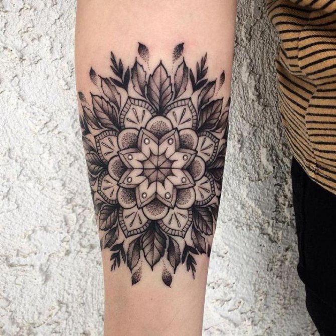 Se si guardano da vicino i disegni di tatuaggi mandala e si esaminano i particolari della loro costruzione, è facile vedere che diverse forme si distinguono. Spesso il disegno più grande dell'intero tatuaggio è un cerchio, con un quadrato iscritto separatamente. All'interno di questo quadrato c'è un altro cerchio. Può essere diviso in segmenti separati. In alternativa, questa divisione assomiglierebbe a un loto.