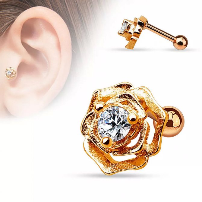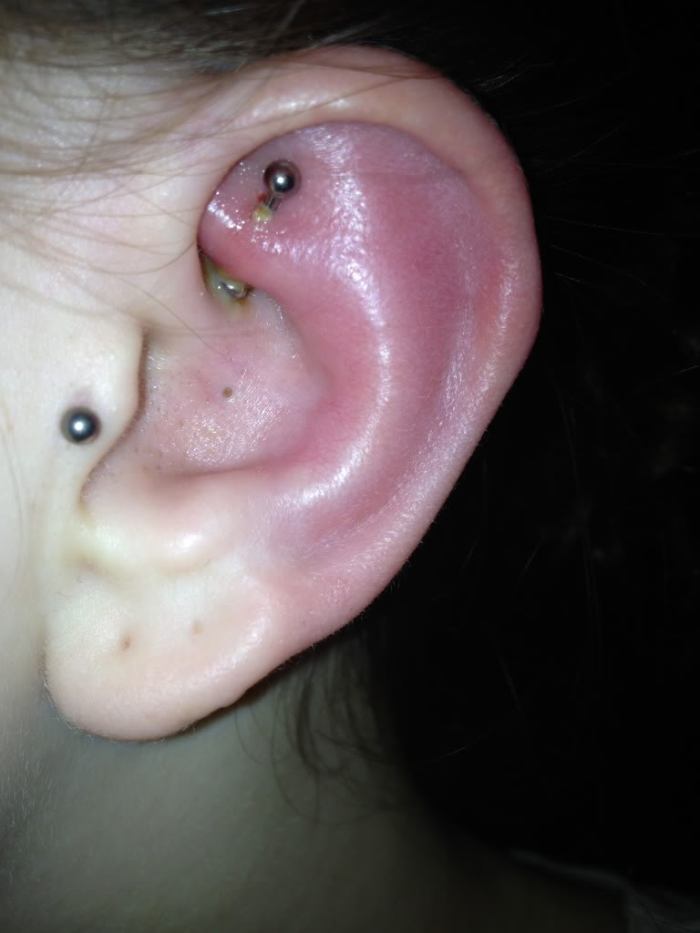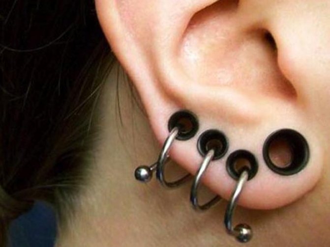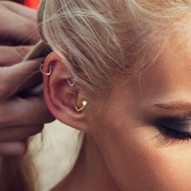 Questo tipo di piercing si applica quando la parte di cartilagine dell'orecchio è perforata. Il piercing alla cartilagine e le sue conseguenze differiscono dal piercing convenzionale al lobo dell'orecchio con un ago o una pistola.