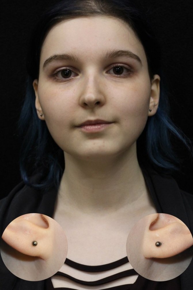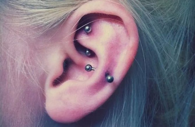 Dall'immagine si vedono anche punture complesse, si possono identificare toccando l'orecchio. Per esempio, c'è una cartilagine densa all'ansa dell'orecchio. E la torre richiede generalmente la foratura di due cartilagini in una volta sola ed è difficile da raggiungere. Non è certamente qualcosa che un dilettante può fare.