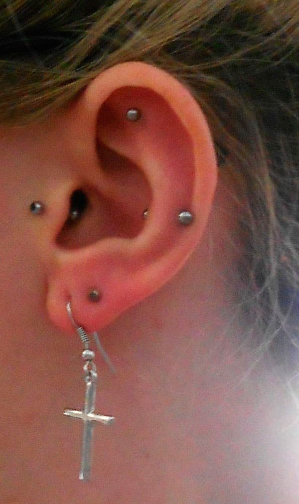 . La particolarità di questo piercing è la disposizione degli orecchini. Il più delle volte, si fanno diversi piercing Helix paralleli, poi vi si inseriscono anelli di uguale diametro.