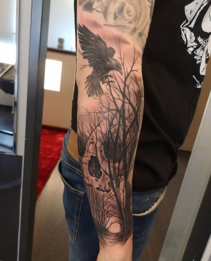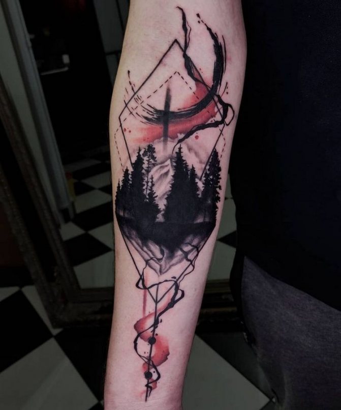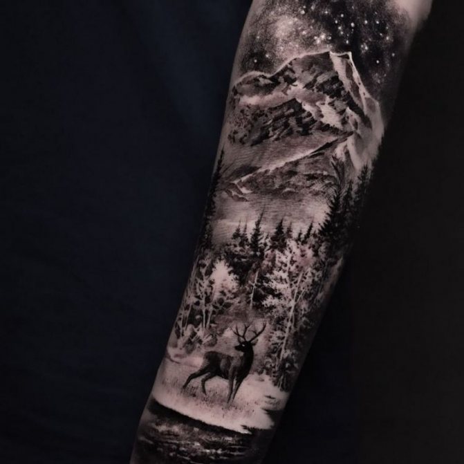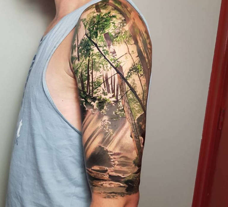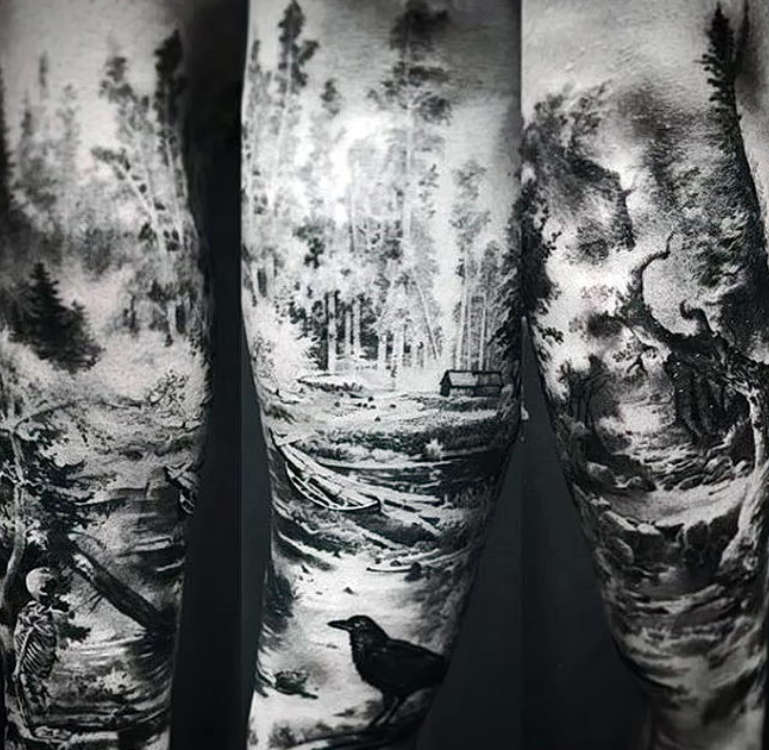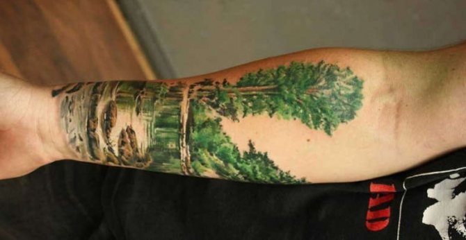 Un tatuaggio con una foresta sul braccio di un uomo rappresenta un paesaggio naturale, esteticamente piacevole, simile a un'opera d'arte. Diversi stili di esecuzione sono applicabili ad esso, come ad esempio: