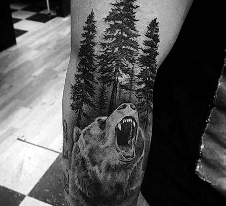 Foresta e orso in primo piano - Il tatuaggio suggerisce che l'uomo è il padrone della propria vita, sente bene le intenzioni degli altri e non si lascerà mai dominare.