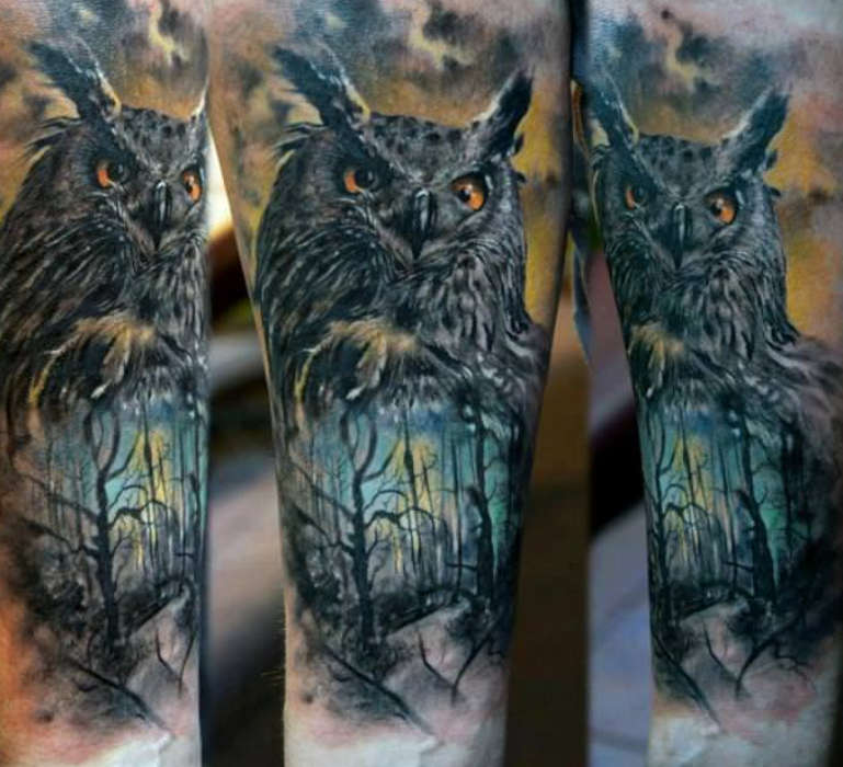 Foresta e gufo - Questo tatuaggio è adatto a uomini prudenti e attenti con una mente astuta e spirito.