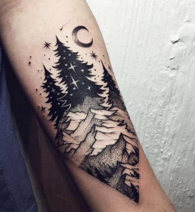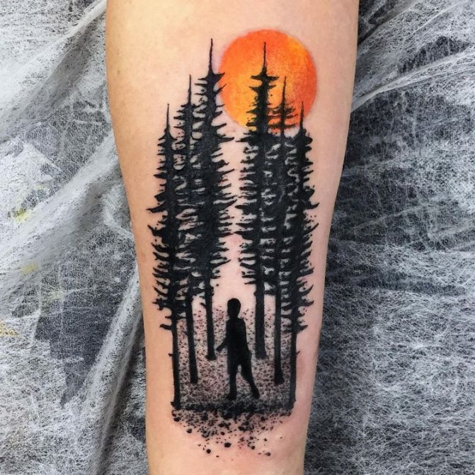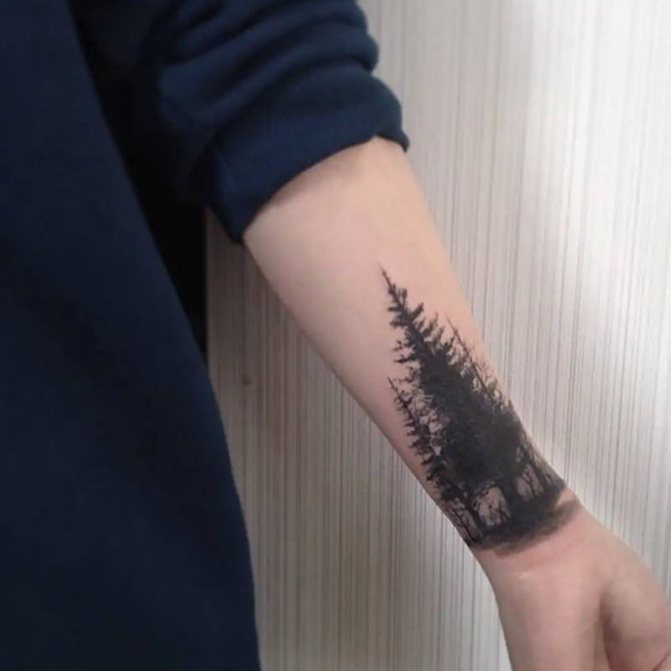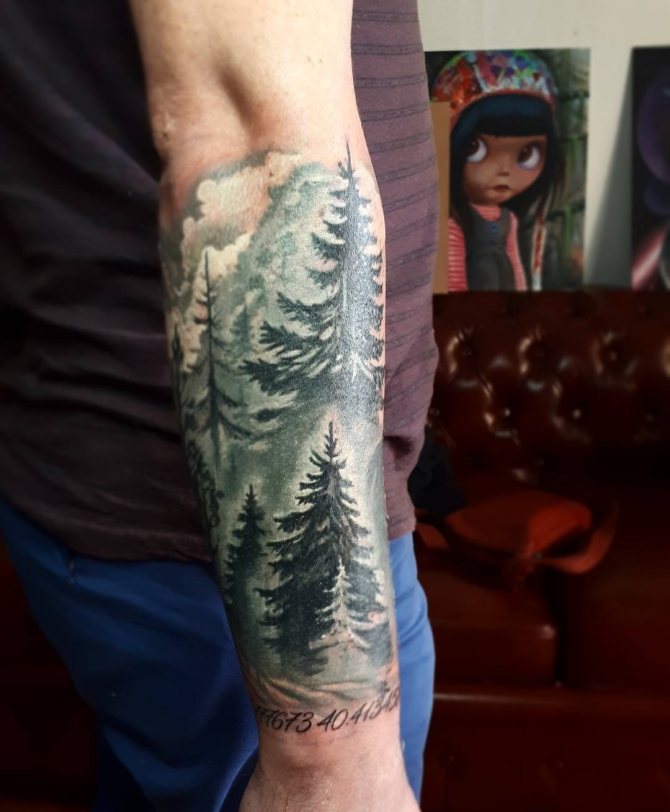 Foresta di conifere - Un indicatore del ricco mondo interiore del proprietario del tatuaggio, un simbolo di eterna giovinezza, la pace. Gli aghi dell'albero fungono da elemento protettivo. Di solito, la foresta sceglie una personalità calma, non conflittuale, che è sempre in grado di proteggersi.