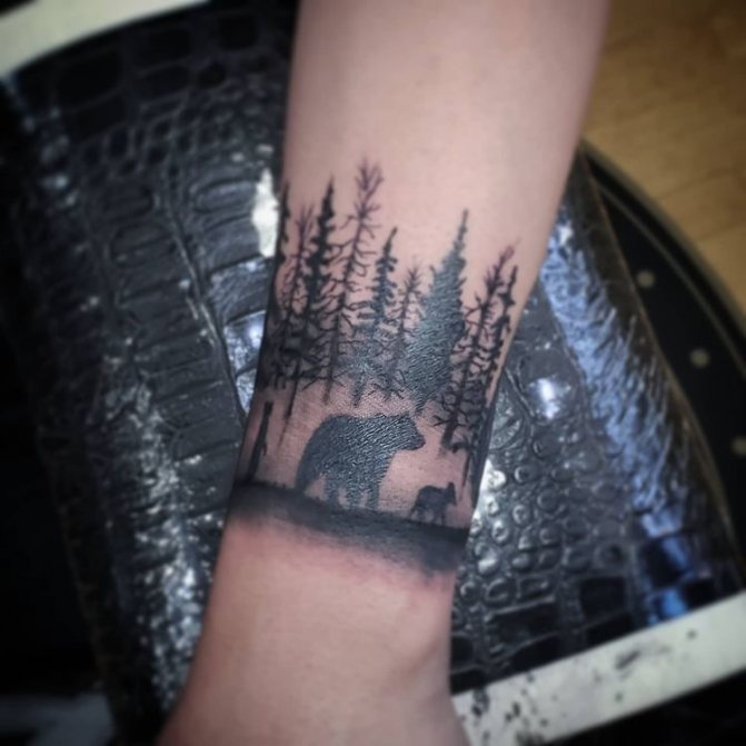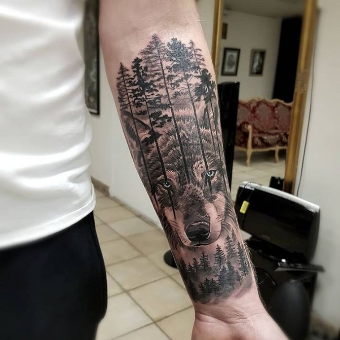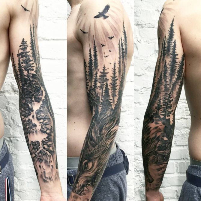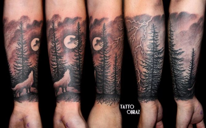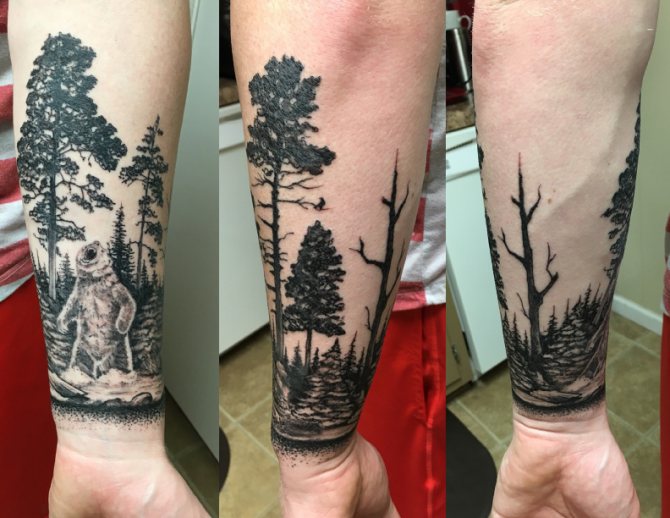 In generale, un tatuaggio della foresta è sempre un disegno grande e realistico che richiede un ampio spazio sul corpo. Idealmente, una densa foresta misteriosa con l'aggiunta di animali guarderà sulla schiena, sul petto, sul lato. Ma la pratica dimostra che nella maggior parte dei casi, gli uomini imbottiscono la foresta sul braccio.