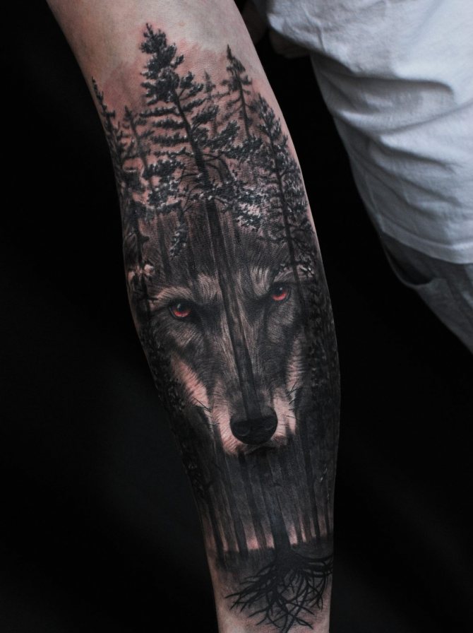 Foresta e lupo in primo piano - Il portatore del tatuaggio è un uomo sicuro di sé e autosufficiente.