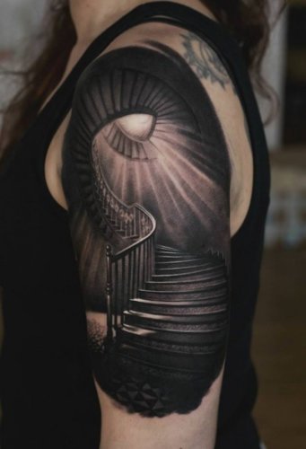 Nella galleria di tatuaggi di scale che accompagna questo articolo puoi vedere diversi tipi di disegni, sia scale convenzionali che scale a spirale o a chiocciola. Come potete vedere, Molte persone scommettono su una scala simulata, la cui fine è la porta d'ingresso dell'aldilà..