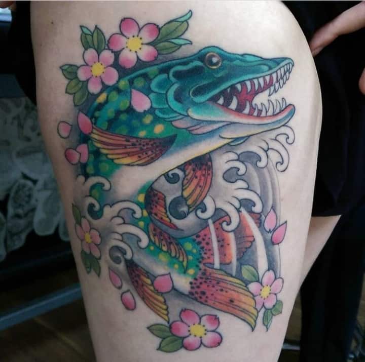 Un tatuaggio con un carnivoro dai colori vivaci è un indicatore della natura mercantile di chi lo indossa. La nuova immagine scolpita mostra il desiderio di attirare l'attenzione sulla sua persona, ma non solo per piacere, ma per trarre qualche beneficio dalla comunicazione con gli altri. Proprio come un luccio tende un'imboscata ad una preda che a volte è della sua stessa taglia, le ragazze con un tatuaggio di un predatore dentato affascinano abilmente e ottengono ciò che vogliono, tirando soldi e informazioni da amici e ammiratori, approfittando delle loro connessioni e del loro status.