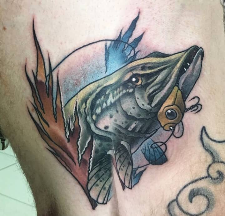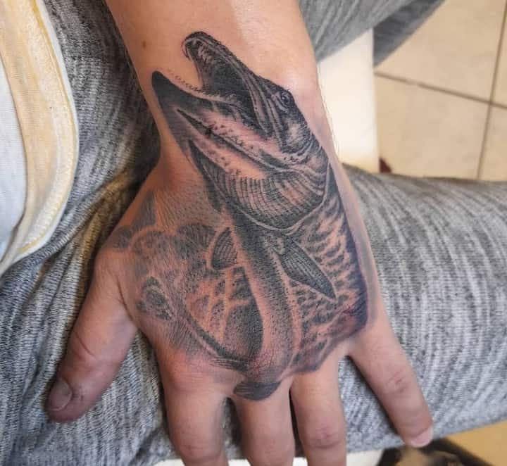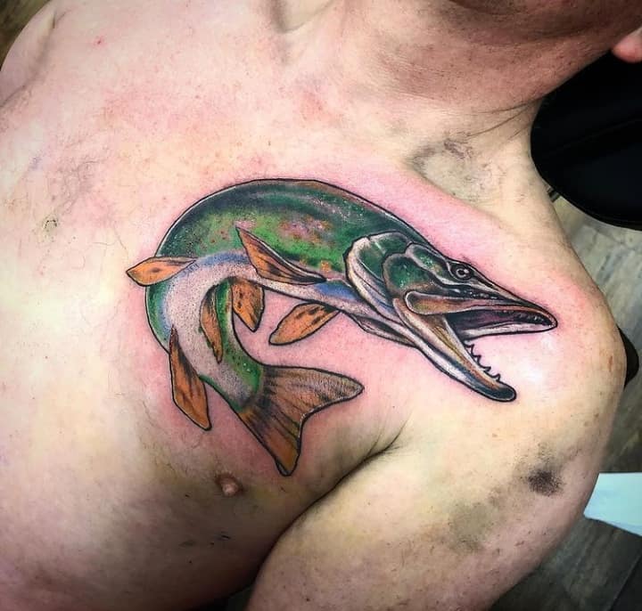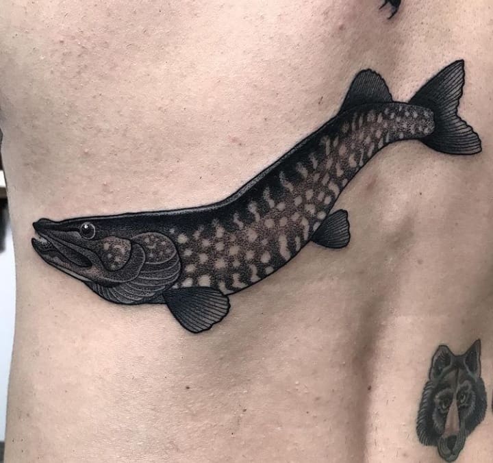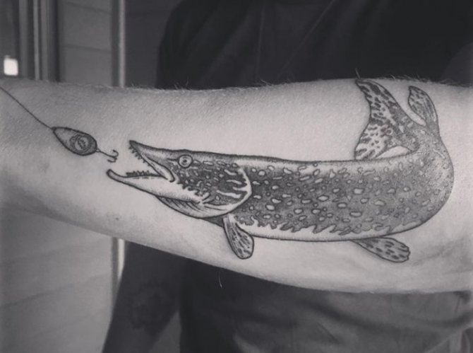 Un tatuaggio realistico con un luccio raffigurato nel modo più veritiero possibile rivela subito un appassionato di pesca. Il luccio, che ha ingoiato un amo, è un simbolo della grande esperienza del pescatore e della sua capacità di superare in astuzia l'astuto predatore. Una foto di un uomo con un luccio in agguato è il segno di un uomo con grande pazienza, mente calcolatrice e curiosa. Il tatuaggio di grandi dimensioni caratterizza il proprietario come una persona potente e influente.