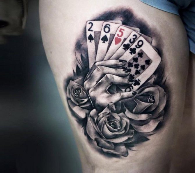 Il tatuaggio delle carte da gioco non è spesso scelto dal sesso debole. Di tanto in tanto, però, si fanno un tatuaggio di uno. Questi sono per lo più atei. Ci possono essere altri attributi di gioco, fiori, simboli di lettere e così via. Gli elementi aggiuntivi sono destinati a nobilitare il design. La bellezza del tatuaggio è importante per la ragazza. Le carte dei tatuaggi sono adatte ai giocatori d'azzardo. Si tatuano un'immagine del genere per assicurarsi buona fortuna.