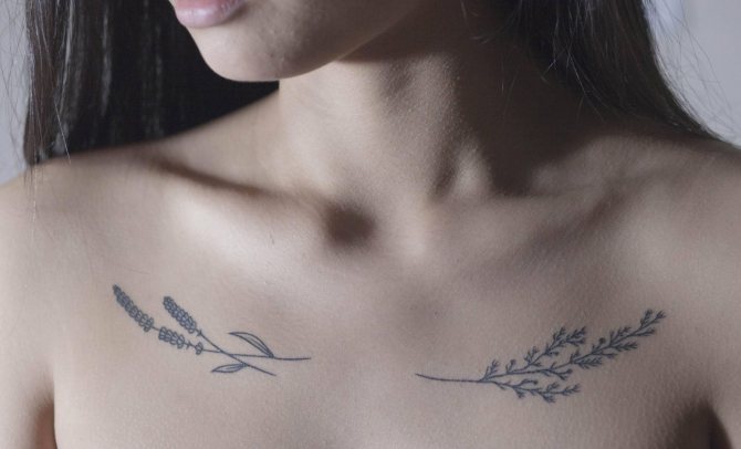 Un'altra opzione per la ragazza con il tatuaggio più gentile. Un delicato rametto sulla clavicola attira l'attenzione sulla curva del collo e sulla delicata clavicola, esaltando la grazia della figura. Lillà, lavanda, fiori di ciliegio in fiore e altri delicati rametti di piante possono essere tatuati sulla clavicola.