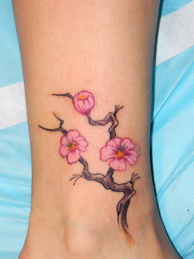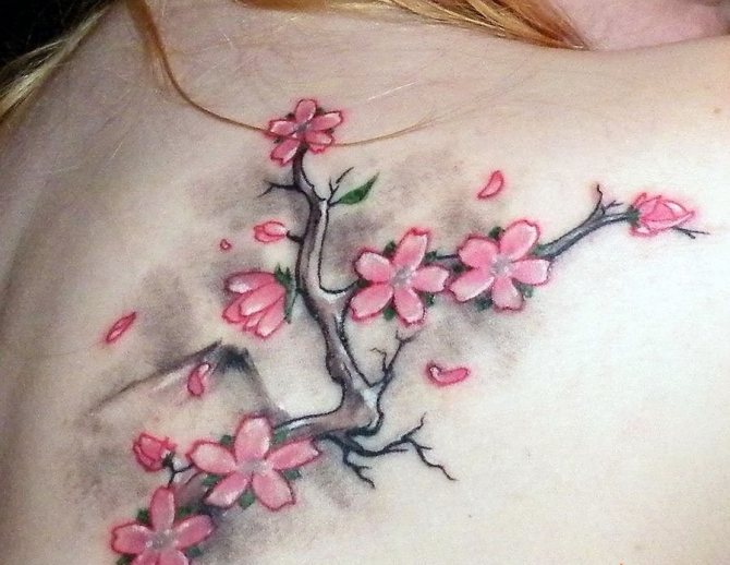 Spesso un motivo di fiori di ciliegio è scelto dagli amanti della cultura giapponese a causa dell'eloquenza del simbolo. Il fiore di ciliegio è bello in modo minimalista, realistico e stilizzato. Questo tatuaggio può essere di qualsiasi dimensione, come la schiena intera, la gamba o il braccio.