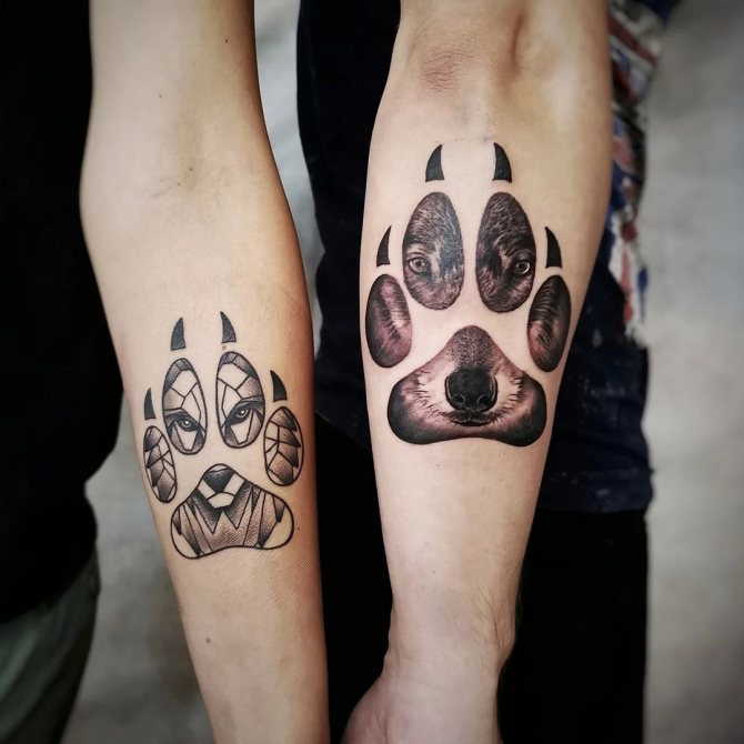 - L'impronta della zampa del lupo sulla mano parla del carattere fermo del proprietario e della sua incredibile forza fisica. È meglio fare un tale tatuaggio alto, uomini maestosi con build atletico per sottolineare il suo potere.