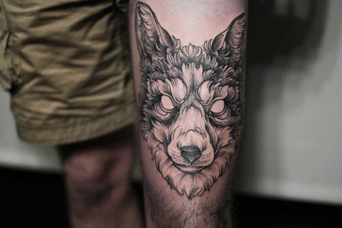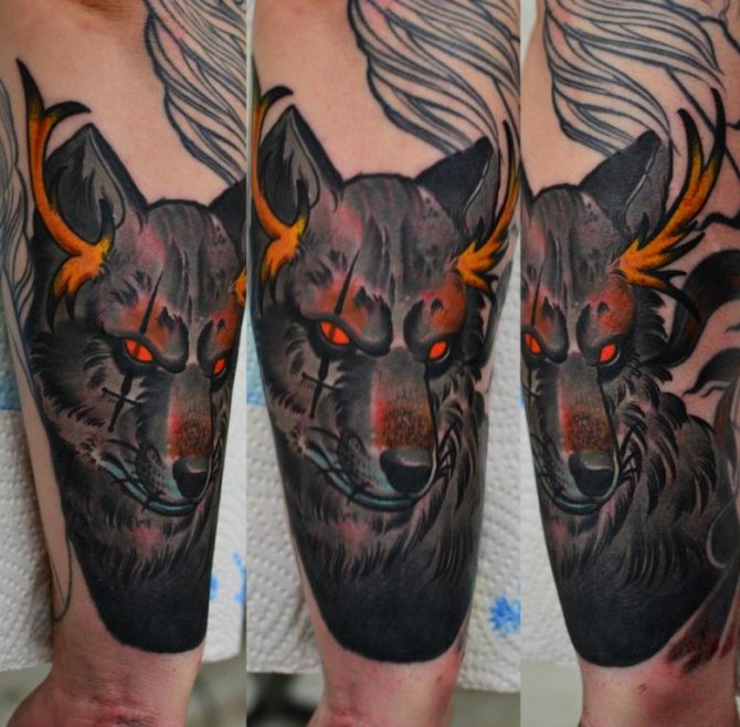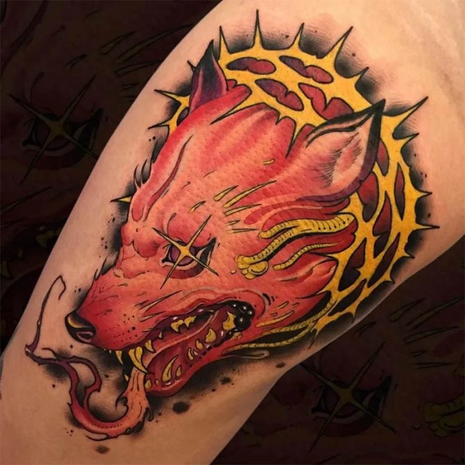 Un lupo con la bocca aperta, raffigurato sul corpo, caratterizza la persona che ha causato il tatuaggio come un combattente impavido e risoluto, che ha un forte nucleo interiore e un ricco mondo spirituale.
