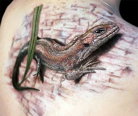 Abbastanza spettacolare sembra tatuaggio lucertola sul braccio, gamba o schiena in una tecnica 3D. I disegni sembrano super naturali, ci si potrebbe anche chiedere se è un'immagine o una lucertola viva.Sulla caviglia, è meglio fare un tatuaggio in stile realismo. Si tratta di dettagli e colori forti.