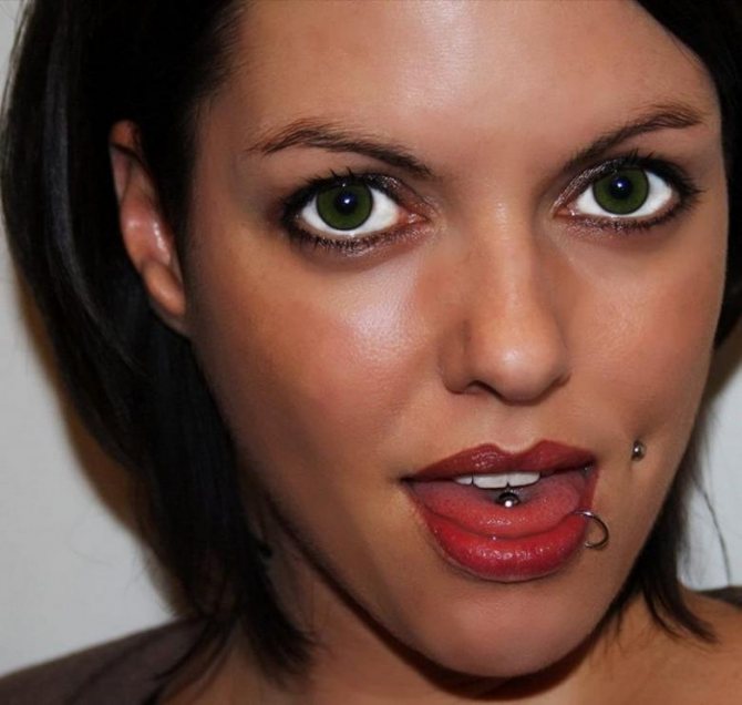 Un altro tipo popolare di piercing è il frenulo. Questa procedura di inserimento di un frenulo nella lingua è meno dolorosa, meno sangue viene espulso durante l'operazione e la superficie della ferita guarisce molto più velocemente.