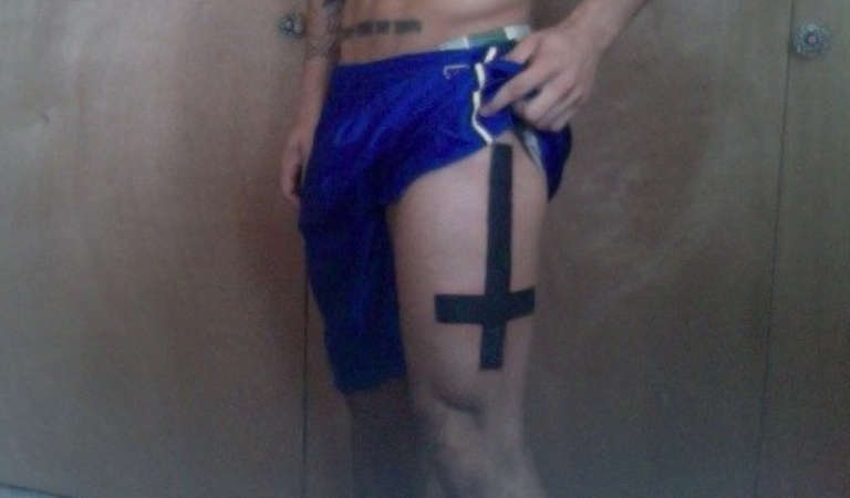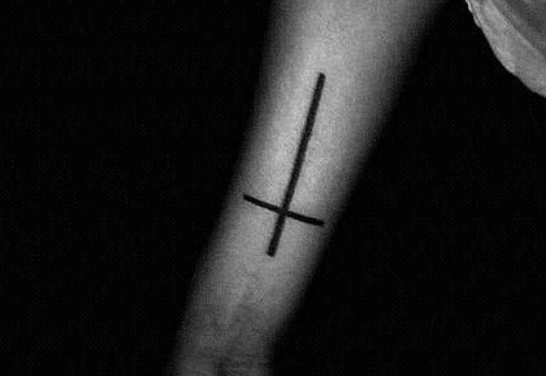 Croce rovesciata - simbolo magico che si collega alle forze oscure, e la verticale allungata è un collegamento con Satana, che copre la santa trinità.