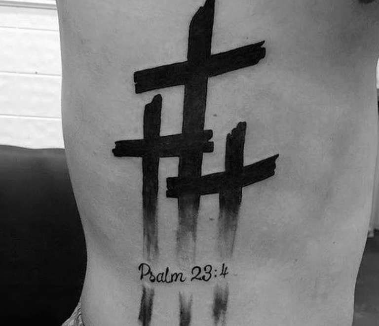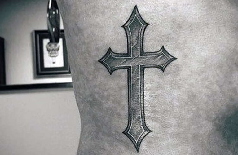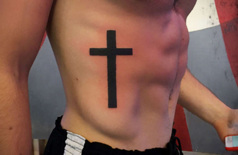 La croce è tatuata sul lato del corpo di un uomo per motivi personali - più spesso, rappresenta la fede e il riconoscimento di Dio. Può anche essere un simbolo che rafforza la fede in se stessi, il proprio lato luminoso.