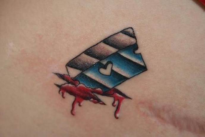 Se la lama trafigge il cuore, suggerisce che chi la indossa ha subito una grande delusione d'amore e sta vivendo un grande dolore al cuore. Una tale persona non può lasciare andare il suo risentimento e ha chiuso il suo cuore ai membri del sesso opposto. Se un rasoio taglia una rosa o un altro fiore, indica una grande perdita, la perdita di una persona cara o una separazione difficile. I tatuaggi di rasoio in combinazione con un cuore e un fiore caratterizzano lo stato emotivo e i sentimenti di una persona. La natura del tatuaggio e la sua interpretazione dipendono dalle caratteristiche dell'immagine.