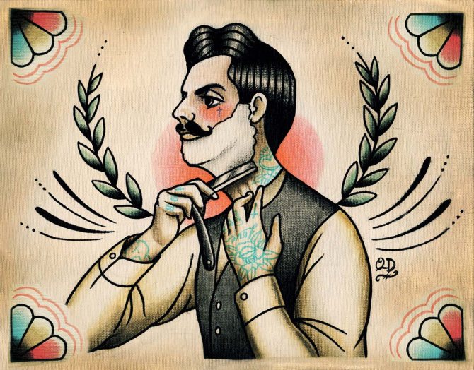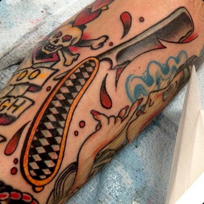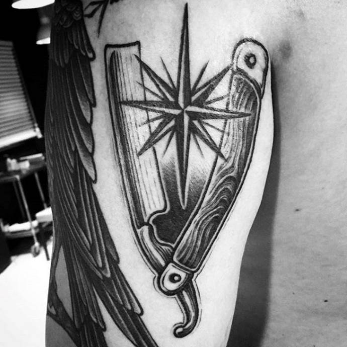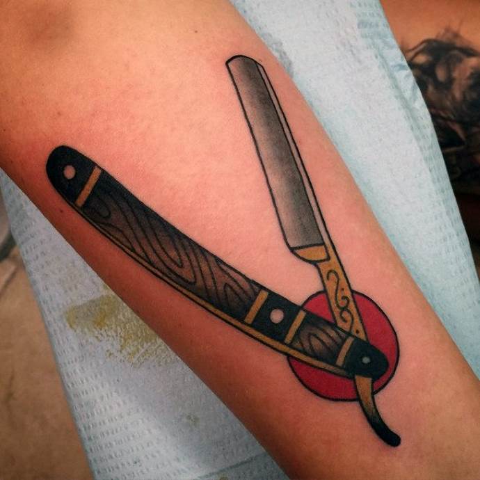 Per compensare la sete di sangue e l'energia negativa del rasoio, uno stile old-school farà il trucco. La tecnica, che ha avuto origine con i marinai americani nel XIX secolo, continua a tenere banco nella body art di oggi. Il tatuaggio non è prominente per convessità e volume, ma attira l'attenzione con i suoi colori saturi e i suoi contorni chiari. Il profilo ampio è il segno distintivo di questo stile. Una pistola, una ragnatela e un'iscrizione a tema possono essere aggiunti a una lama di rasoio. Allora la composizione sarà unica ed esclusiva. La schiena, la spalla, la gamba, la coscia e il petto sono adatti a disegni su larga scala.