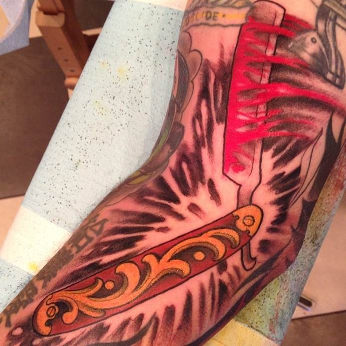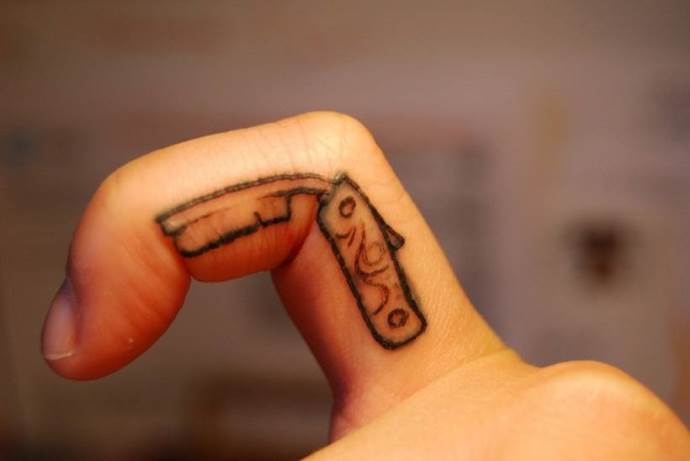 La lama del tatuaggio è spesso fatta in uno stile realistico. Questo disegno sembra molto naturale grazie ai dettagli, al gioco di ombre, alla ricca tavolozza di colori e alla varietà di sfumature. Come le forbici, il rasoio può essere cesellato nella pelle e coperto di sangue. Un piccolo tatuaggio è meglio farlo su una mano, un polso o un avambraccio.