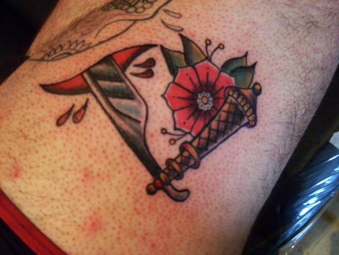 Se una lama di rasoio perfora la pelle e vi si disegnano delle gocce di sangue intorno, il tatuaggio è un'indicazione della propria fortuna. Il tatuaggio può significare che la persona ha sperimentato molti tradimenti, è delusa dalle persone e non ha più paura del dolore. In un'altra interpretazione, l'immagine comunica che non c'è bisogno di traumatizzare la persona, perché sta già soffrendo molto.