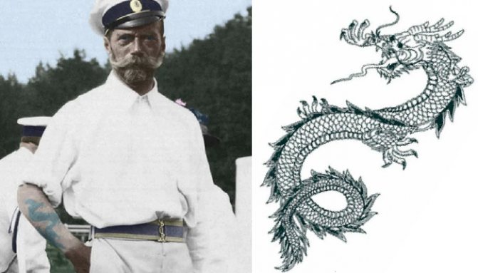 Il tatuaggio del drago è stato posto sull'avambraccio del braccio destro di Nicholas 2. La procedura è stata molto dolorosa ed è durata circa 7 ore. Come risultato, il Tsesarevich ha ottenuto un Drago nero. Non era esattamente nero, però. Il tatuaggio di Nicola II era colorato. Le corna della creatura mitica erano gialle, le zampe verdi e l'addome rosso.