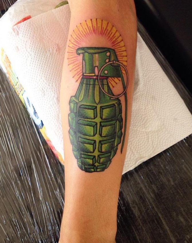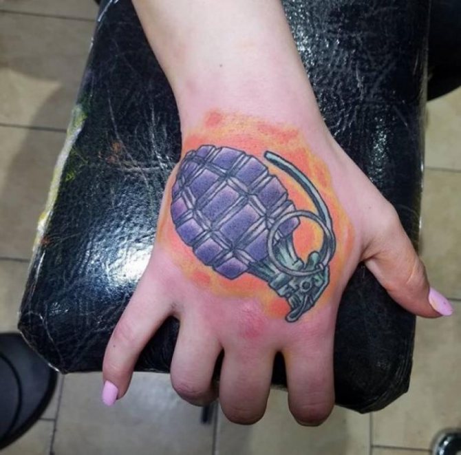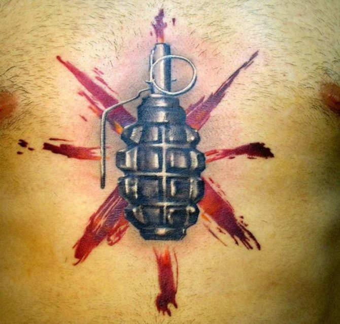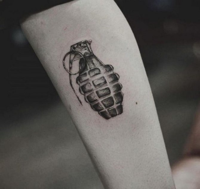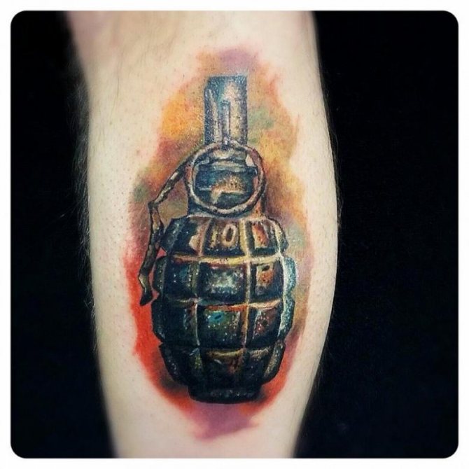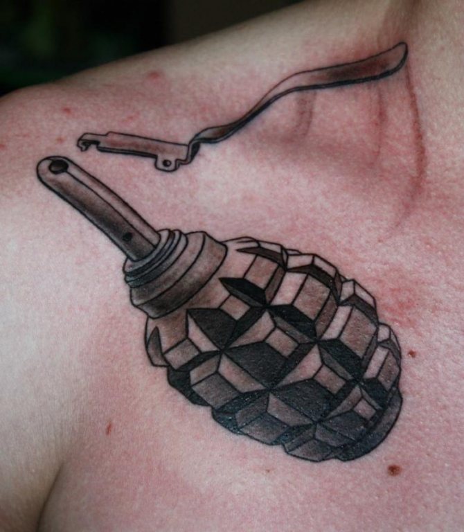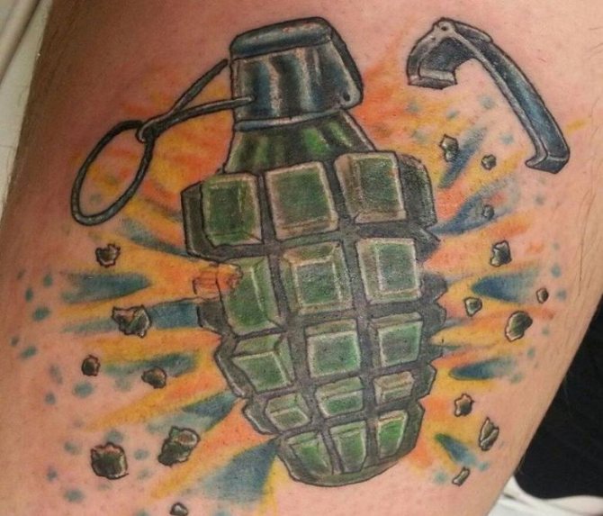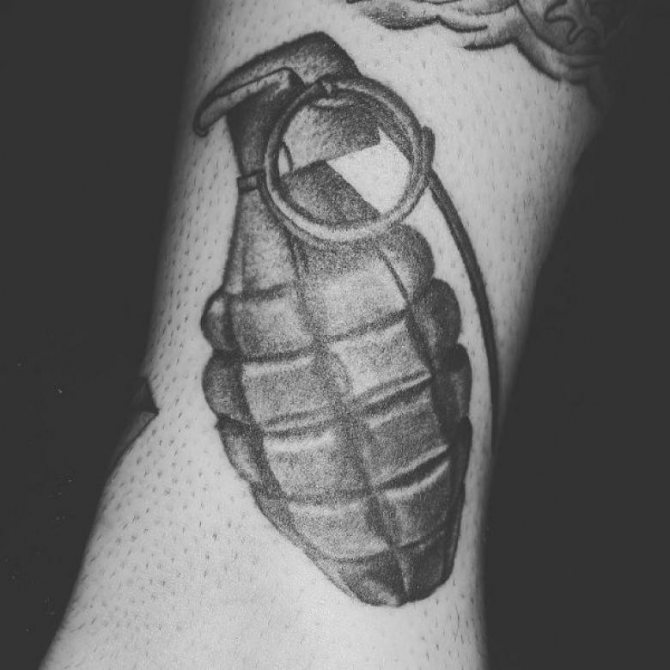 Cosa può dire un simile tatuaggio? Porta con sé una comprensione della minaccia e dell'aggressione che è nascosta ma che può manifestarsi attraverso un'azione attiva. Questo è alluso allo scopo della granata nel mondo reale: esplodere e portare morte.