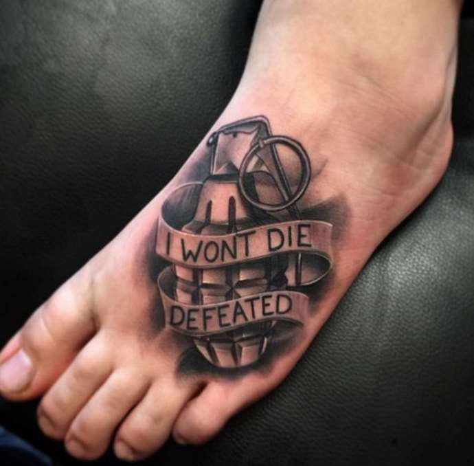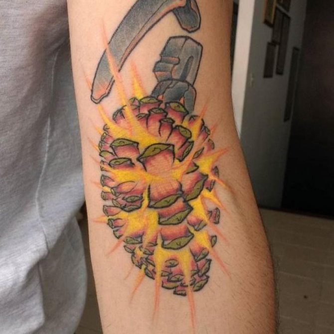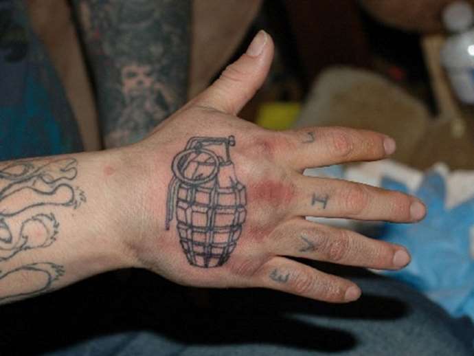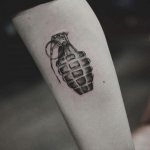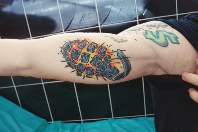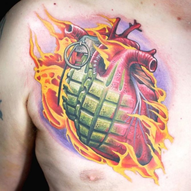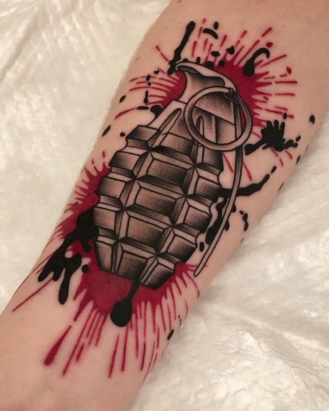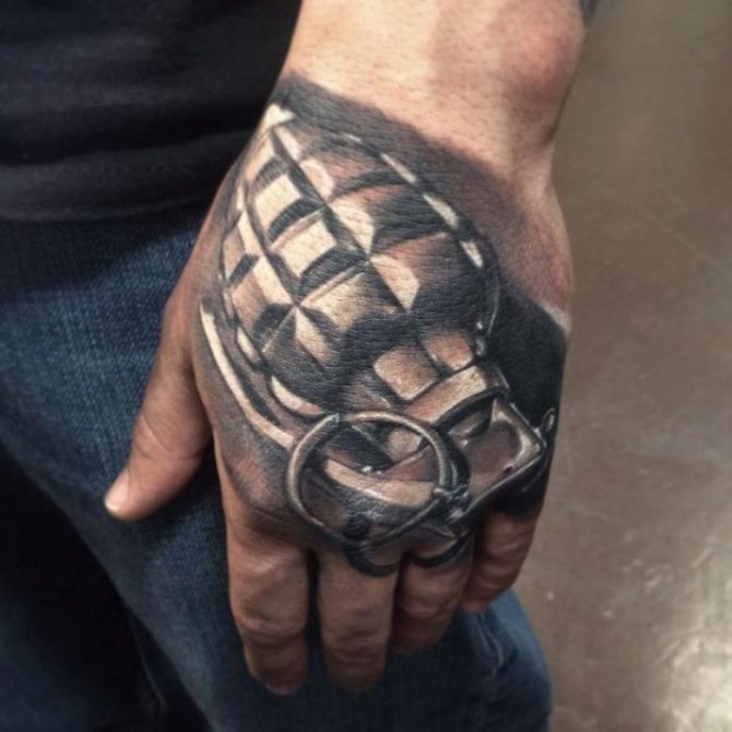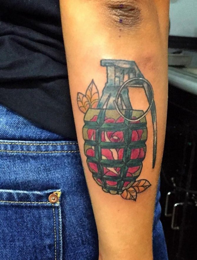 Cosa può dire un simile tatuaggio? Porta con sé una comprensione della minaccia e dell'aggressione che è nascosta ma che può manifestarsi attraverso un'azione attiva. Questo è alluso allo scopo della granata nel mondo reale: esplodere e portare morte.