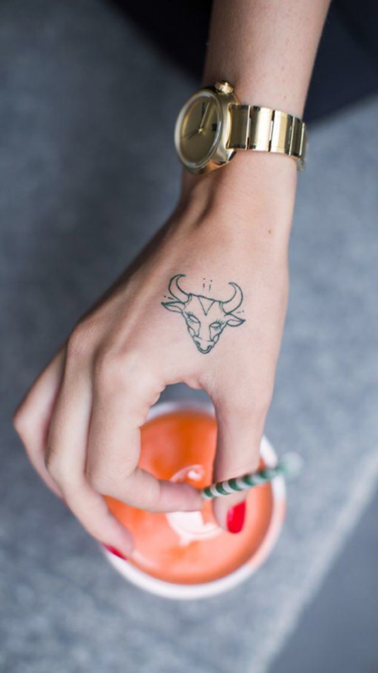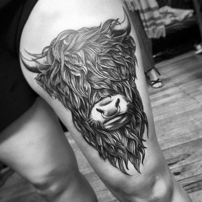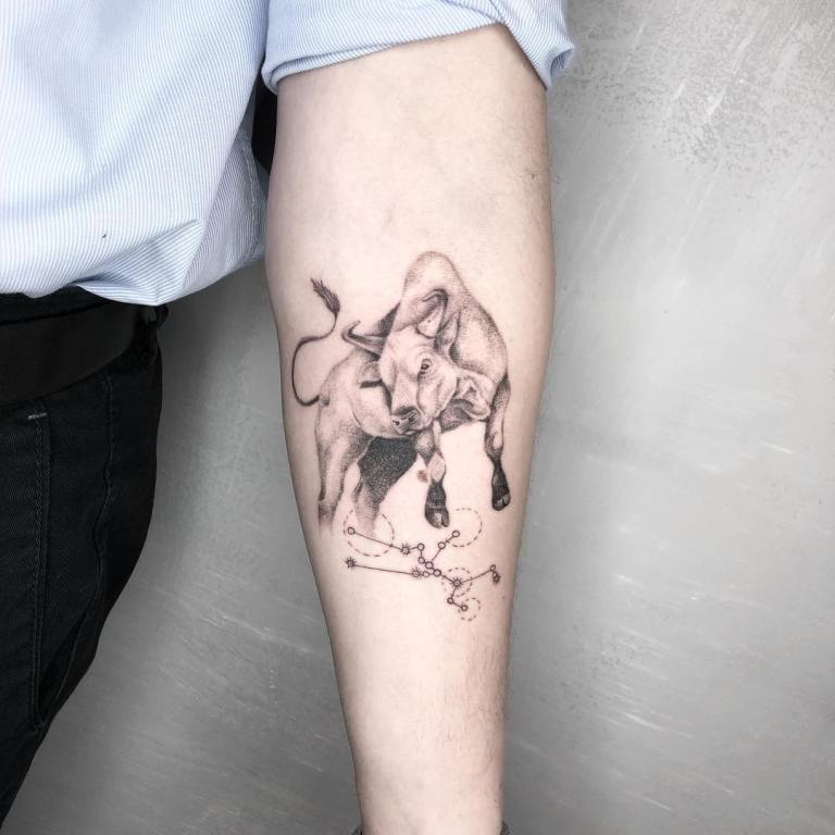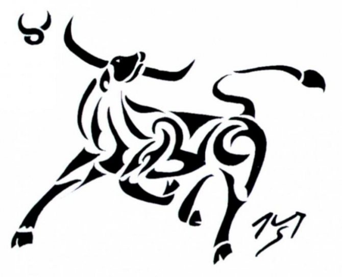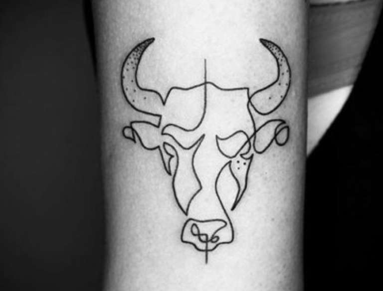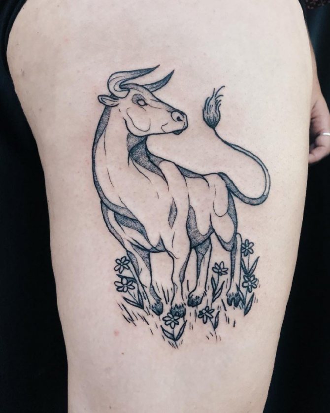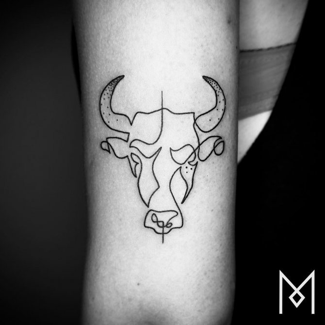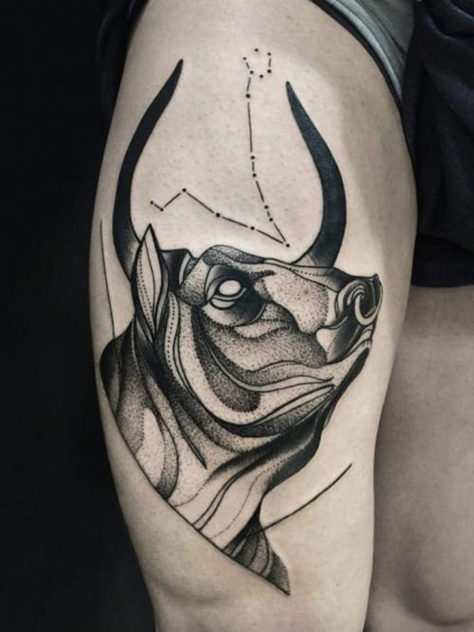 Oltre ad essere emotivo, feroce e testardo, il Toro ha una calma tremenda, quindi gli schizzi dell'animale tranquillo sono anche abbastanza popolari. Il disegno può adornare qualsiasi parte del corpo e può essere un contorno o un'immagine dettagliata. Tutto dipende dalle vostre preferenze. Non è raro che l'immagine di un animale sia combinata in un tatuaggio con una costellazione e altri dettagli.